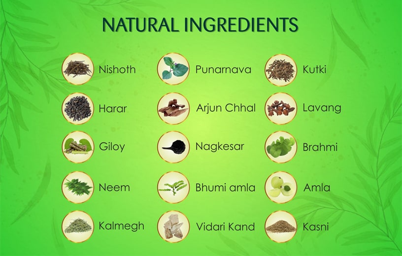 Vidarikand, Amla,Harar Kali, Punarnava, Giloy, Nisoth, Bhringraj, Kasni, Brahmi, Bhumi Amla, Arjun Chhal, Neem, Nagkesar, Kutki, Kalmegh, Lavang.