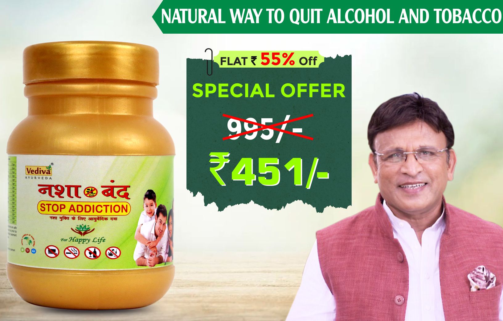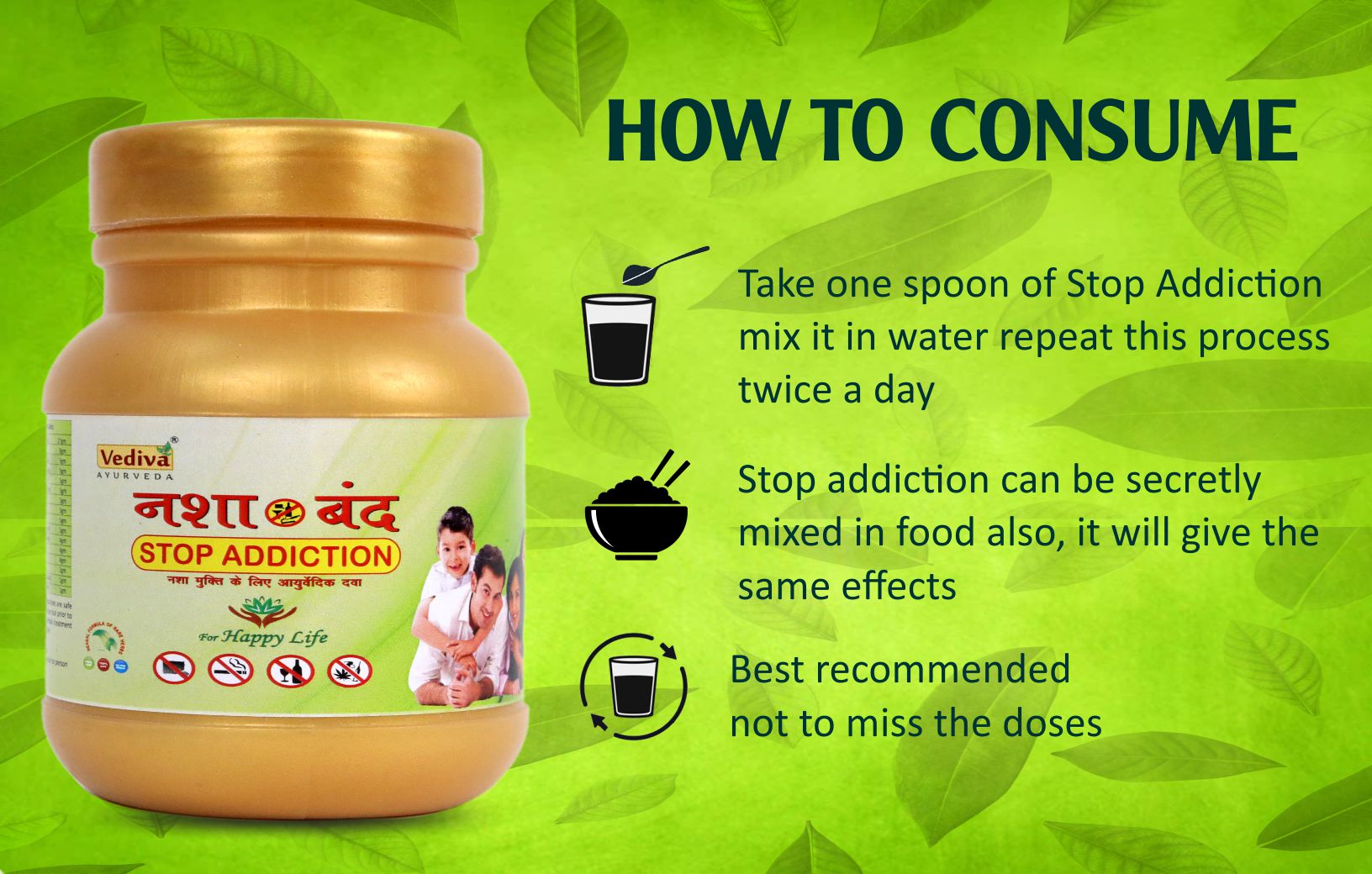Nasha Band is a combination of herbs like Vidarikand, Amla, Harar Kali, Brahmi, Neem, Lavang and other herbs. One can use it with or without the knowledge of the addicted person. The procedure is as simple as to mix it in any of the veg or non-veg food item. It does not change the colour or taste of that food item.